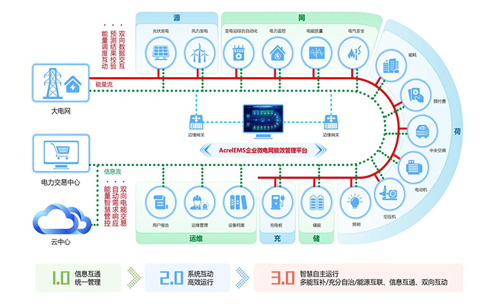 簡介:1.概述 通過在源、網(wǎng)、荷、儲、充的各個關(guān)鍵節(jié)點安裝監(jiān)測、分析、保護(hù)、治理裝置, 通過高性能邊緣計算網(wǎng)關(guān)采集數(shù)據(jù)并上傳至企業(yè)微網(wǎng)平臺。平臺根據(jù)新的電網(wǎng)價格、 用電負(fù)荷、電網(wǎng)調(diào)度指令等情況,調(diào)整各系統(tǒng)控制策略并遠(yuǎn)程下發(fā),使企業(yè)微電網(wǎng)始終高效穩(wěn)定運行, 降低企業(yè)用電成本,實現(xiàn)能源互聯(lián)、信息互動。 2.應(yīng)用場所 適用于各行業(yè)企業(yè)內(nèi)部微電網(wǎng)管理系統(tǒng)的新建、擴建、改建等項目。 3.平臺結(jié)構(gòu) 3.平臺功能 安科瑞AcrelEMS企業(yè)微電網(wǎng)能效管理平臺融合了電力監(jiān)控、電氣安全、照明控制、能源管控、充電樁運營管理、分布式光伏監(jiān)測、儲能管理、設(shè)備臺賬、運維管理等功能,通過一個平臺、一個APP整體的對企業(yè)用電進(jìn)行集中監(jiān)控、統(tǒng)一調(diào)度、統(tǒng)一運維,并且根據(jù)當(dāng)?shù)毓╇姴块T錯峰避峰計劃提前為企業(yè)制定錯峰避峰方案和預(yù)警,滿足企業(yè)